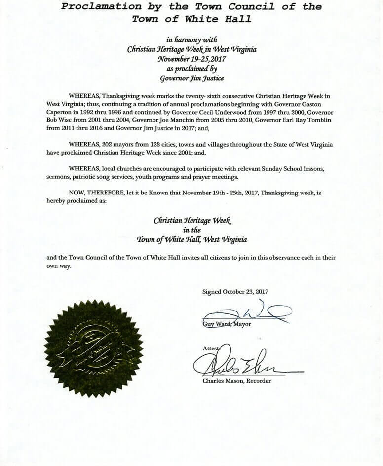 WHEREAS, Thanksgiving Week marks the twenty-sixth consecutive Christian Heritage Week in West Virginia; thus continuing a tradition of annual proclamations beginning with Governor Gaston Caperton in 1992 thru 1996 and continued by Governor Cecil Underwood from 1997 thru 2000, Governor Bob Wise from 2001 thru 2004, Governor Joe Manchin from 2005 thru 2010, and Governor Earl Ray Tomblin from 2011 thru 2016 and Governor Jim Justice in 2017; and,