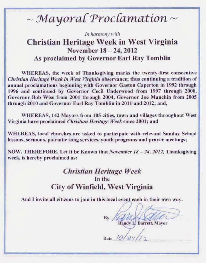 WHEREAS, the week of Thanksgiving marks the twenty-first consecutive Christian Heritage Week in West Virginia observance; thus continuing a tradition of annual proclamations beginning with Governor Gaston Caperton in 1992 thru 1996 and continued by Governor Cecil Underwood from 1997 through 2000, Governor Bob Wise from 2001 through 2004, Governor Joe Manchin from 2005 through 2010 and Governor Earl Ray Tomblin in 2011 and 2012; and,
