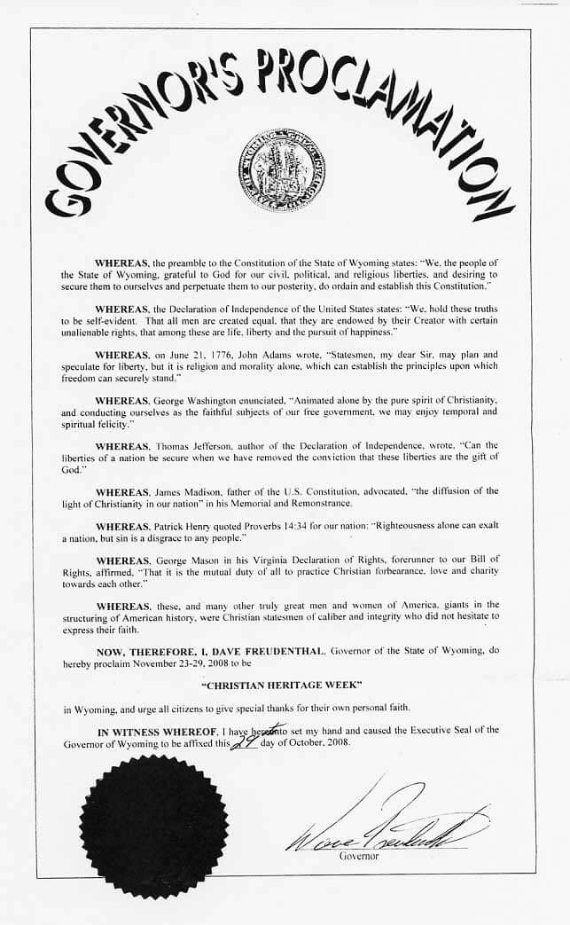 NOW, THEREFORE, I, DAVE, FREUDENTHAL, Governor of the State of Wyoming, do hereby proclaim November 23-29, 2008 to be “CHRISTIAN HERITAGE WEEK” in Wyoming, and urge all citizens to give special thanks for their own personal faith.